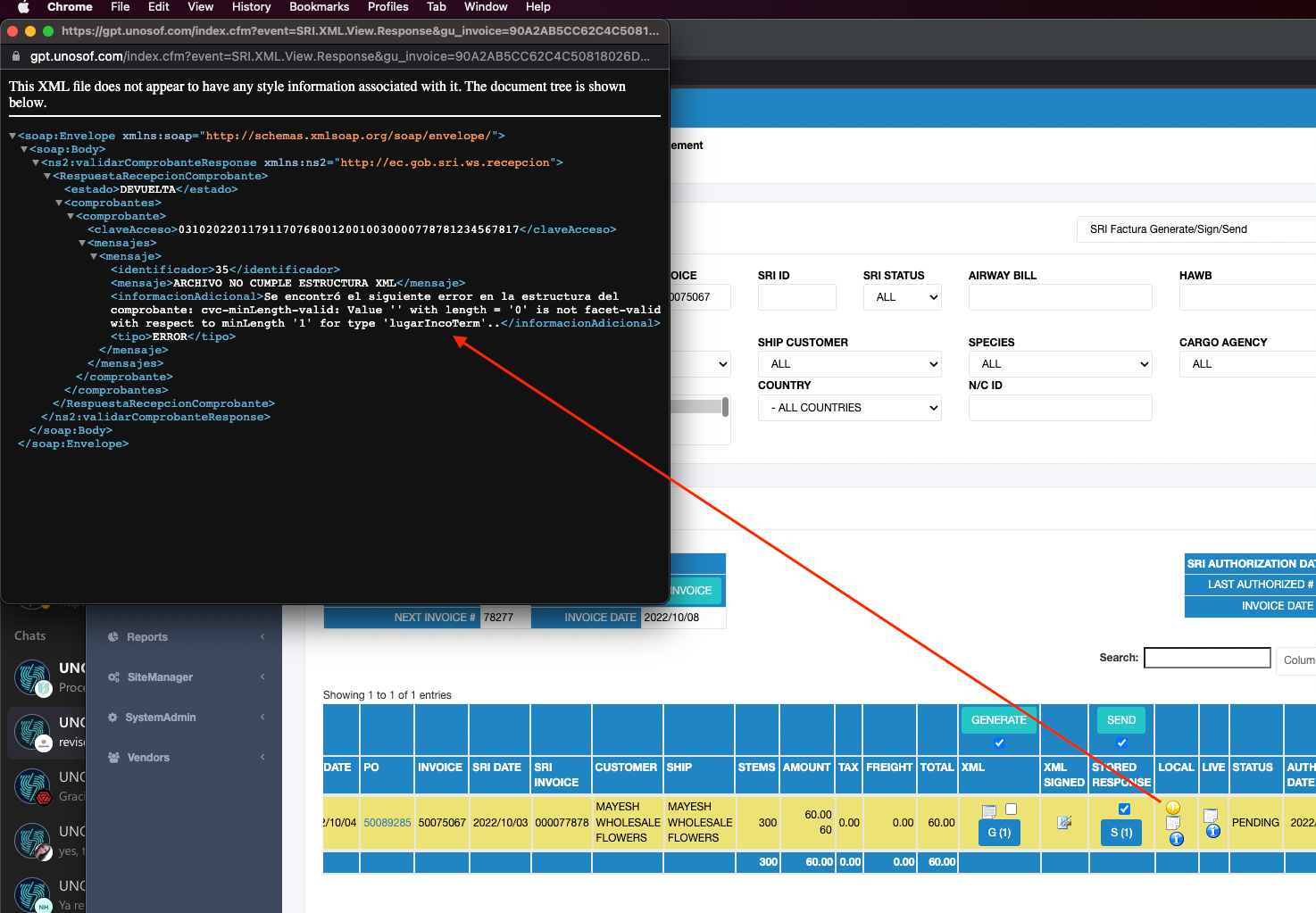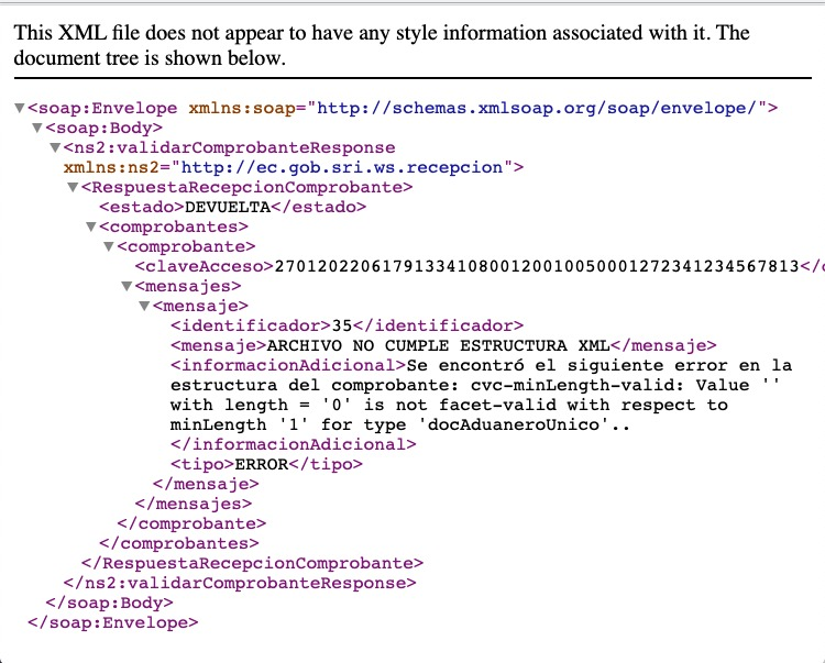 *"FILE DOES NOT MEET XML STRUCTURE The following error was found in the receipt structure: cvc-minLength-valid: Value '' with length = '0' is not facet-valid with respect to minLength '1' for type 'lugarIncoTerm'..."*