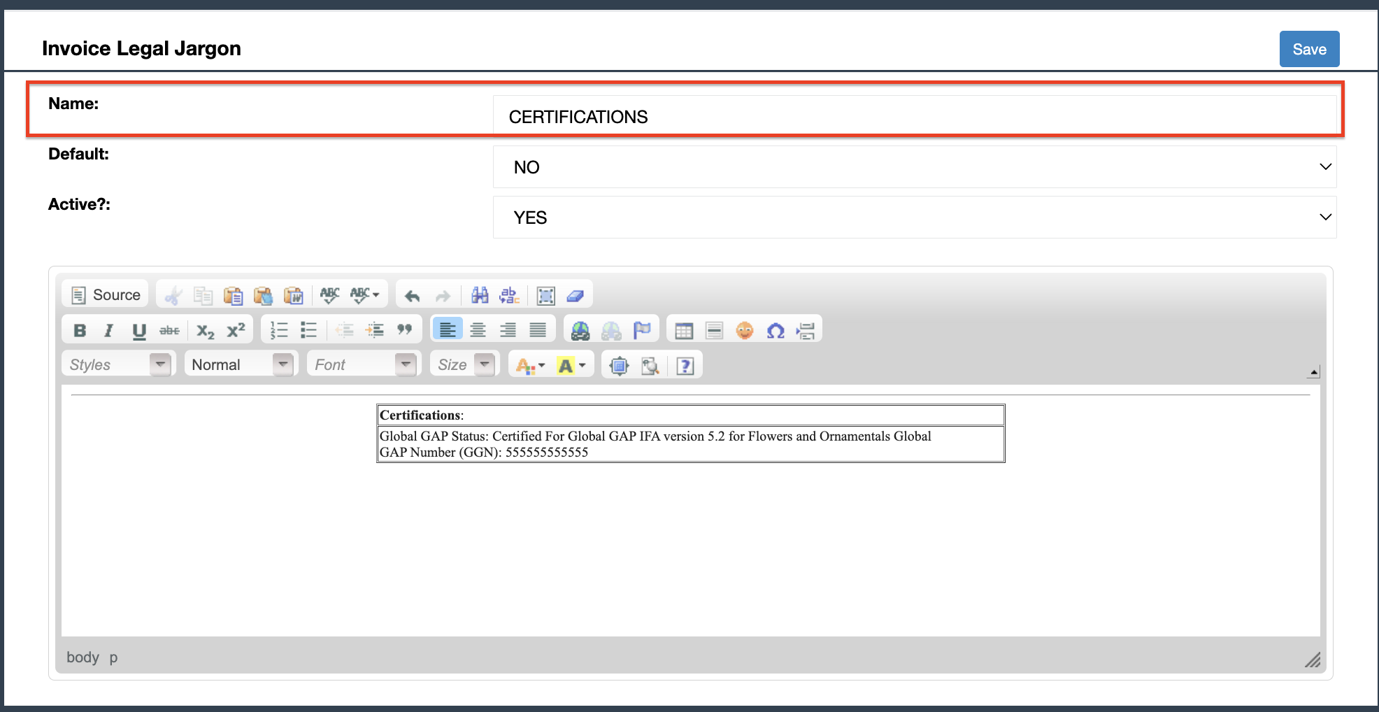 Finally, press on the blue button Save. Your new Invoice Legal Jargon will appear after you press Search.