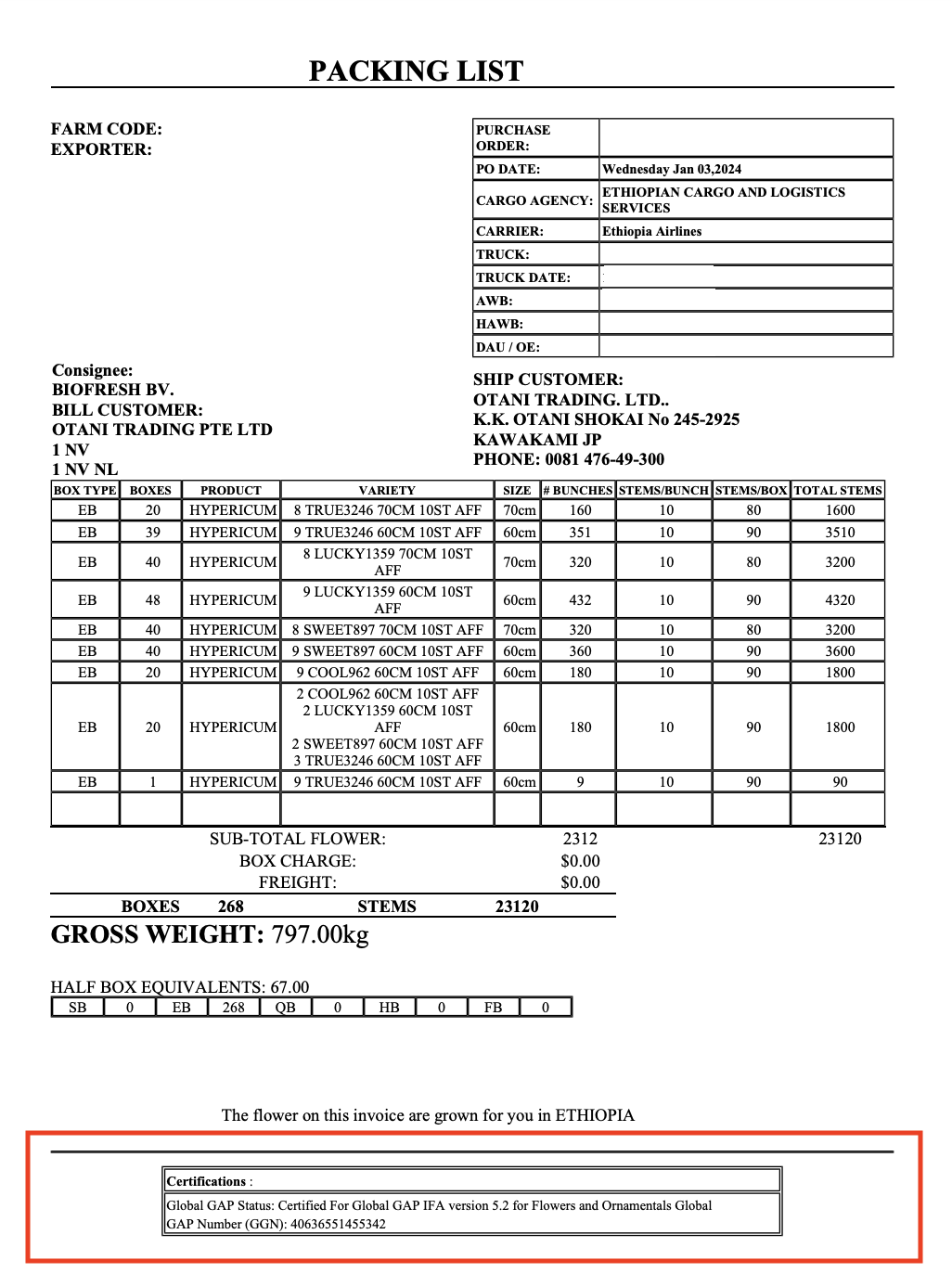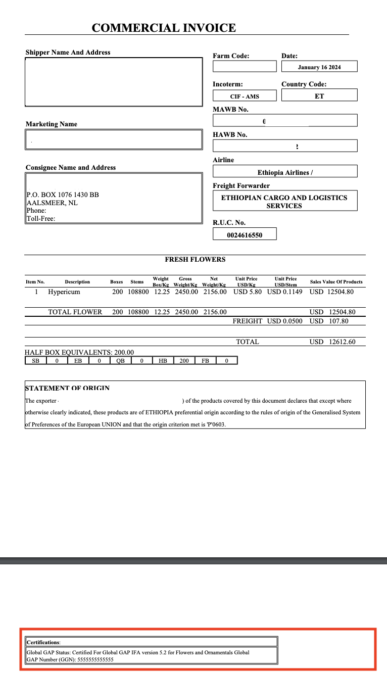 It is possible to add a specific footer to the Packing List and Commercial Invoice for Ethiopian Farms by naming the footer as CERTIFICATIONS. This footer is aimed to customize and list all the certifications a farm can have.