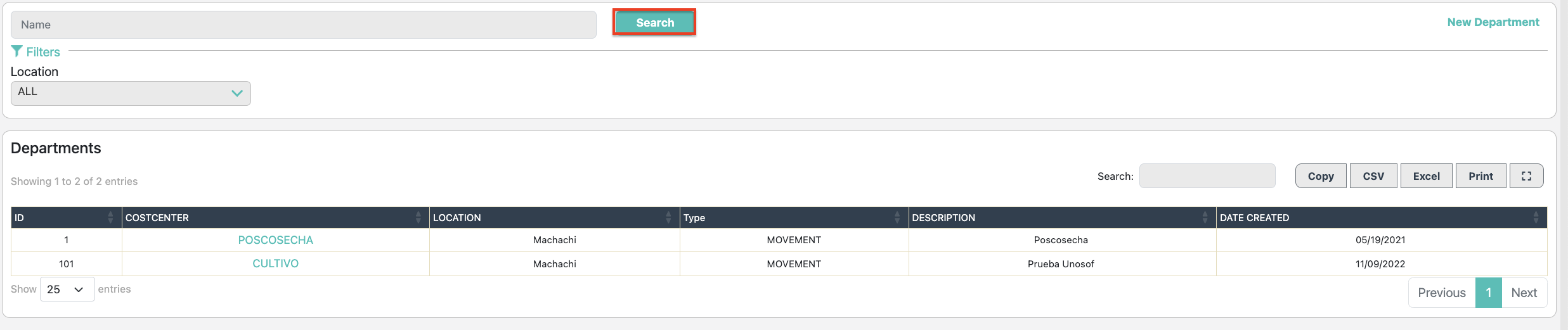 Una vez completa la información haga click en **Save & Close** para guardar el nuevo departamento de trabajo. La pantalla se refrescara automáticamente, por favor, haga click en **Search** para visualizar los departamentos creados.&#x20;