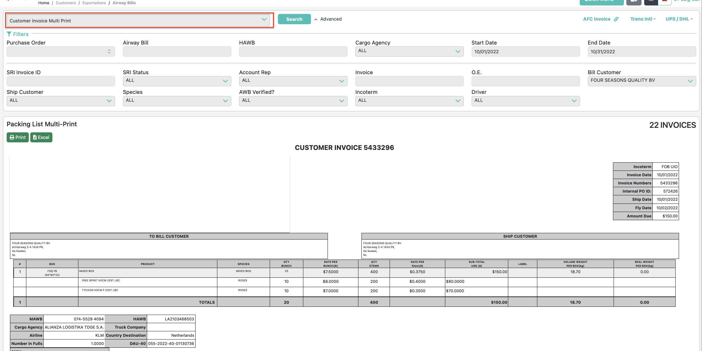 Para la impresión masiva de facturas comerciales haga uso de la opción **Commercial Invoice Multi Print**